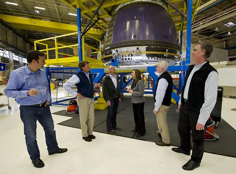 NASA Deputy Administrator Lori Garver, fourth from left meets Blue Origin Founder Jeff Bezos next to Blue Origin's crew capsule along with other Blue Origin team members at the company's headquarters in Kent, WA.